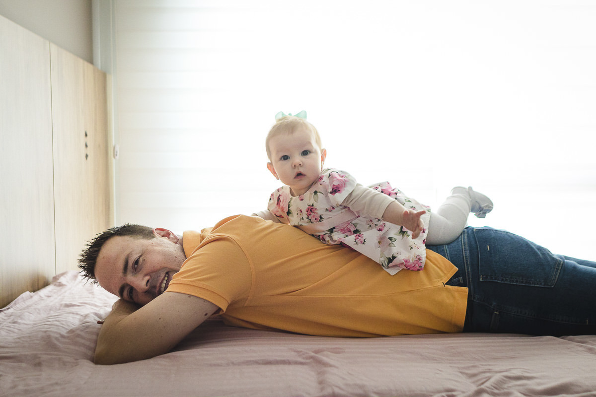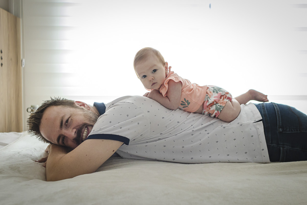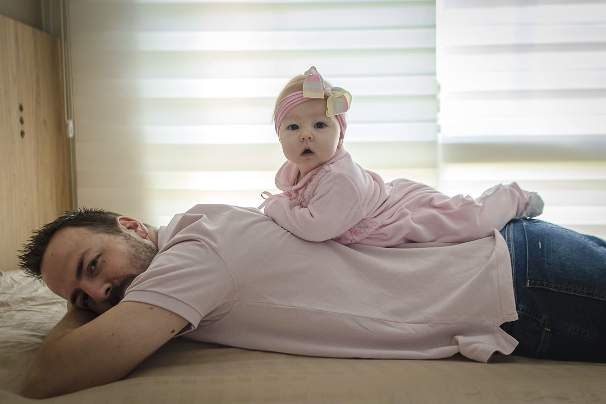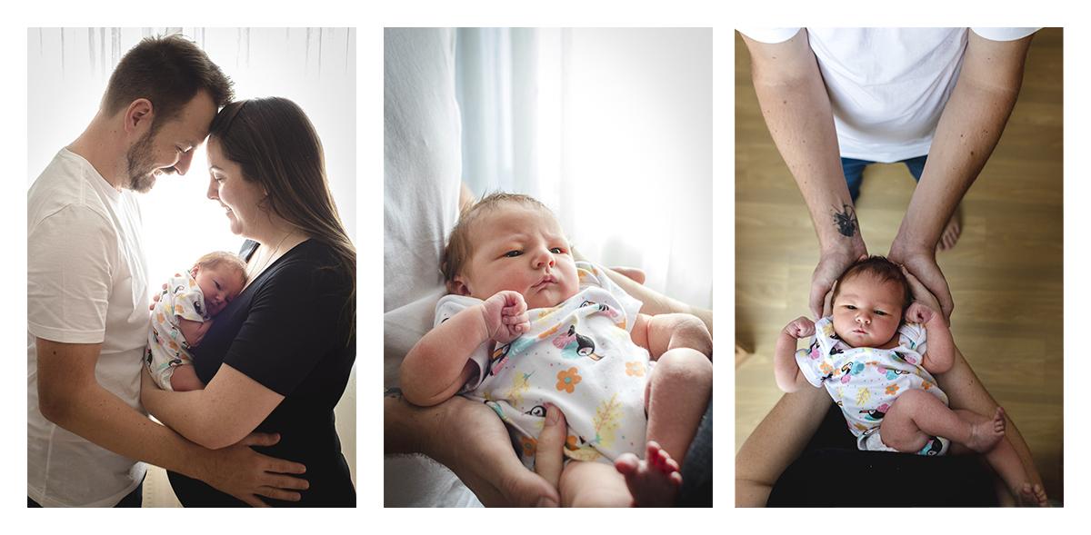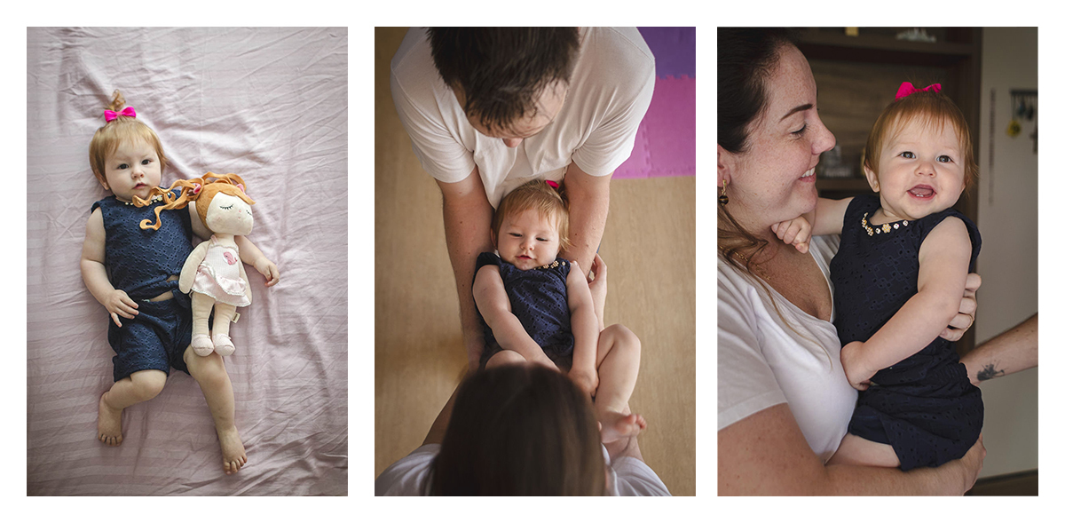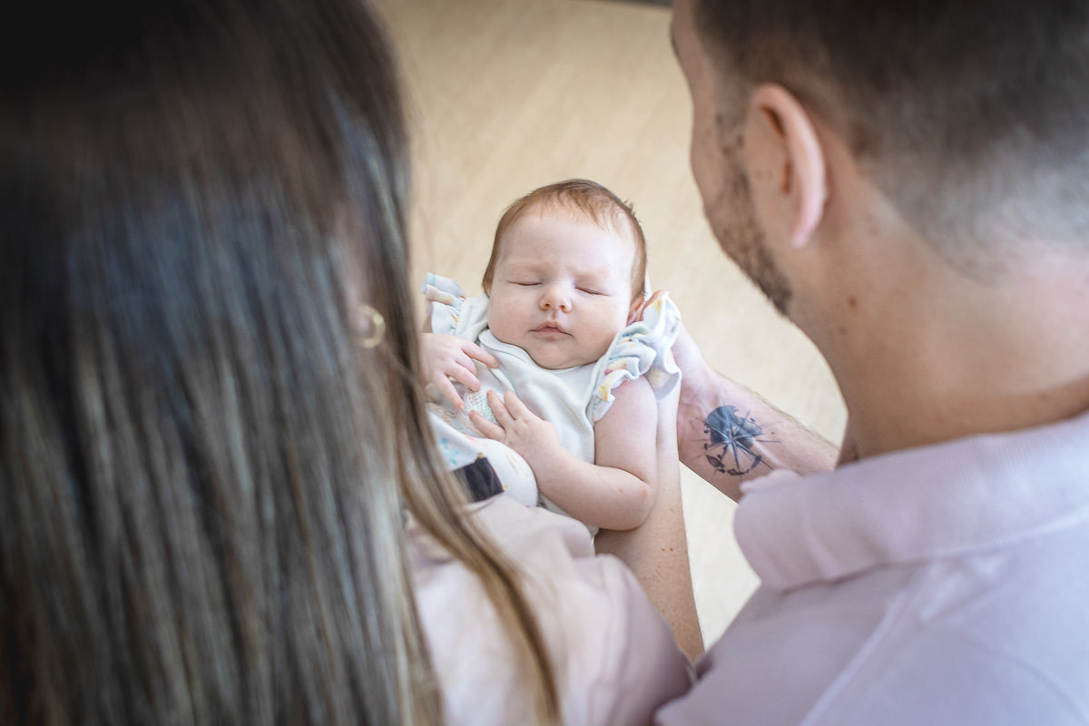 Essa sessão fizemos na casa da vovó da Maria Antonieta, pois nas primeiras semanas a Isa ficou por lá para aproveitar a rede de apoio familiar. A Isa e o Raul falaram que tinham duas ideias para fazer em sequência para mostrar o crescimento da Maria Antonieta. A primeira era ela deitada nas costas do Raul e a outra era ela deitada com a bonequinha de pano que ganhou de presente antes mesmo de nascer e assim começamos logo na sessão de Newborn Lifestyle. Foi então que eu sugeri uma terceira pose, que é uma que eu adoro fazer dos bebês: Uma foto de cima para baixo, com a Isa e o Raul um de frente para o outro, com a Maria Antonieta deitada nos braços deles e virada para cima. Bem, o legal dessas 3 fotos é que com o passar do tempo todas ficam cada vez mais desafiadoras de fazer. Acompanha só nas fotos aqui em baixo que você vai perceber.
