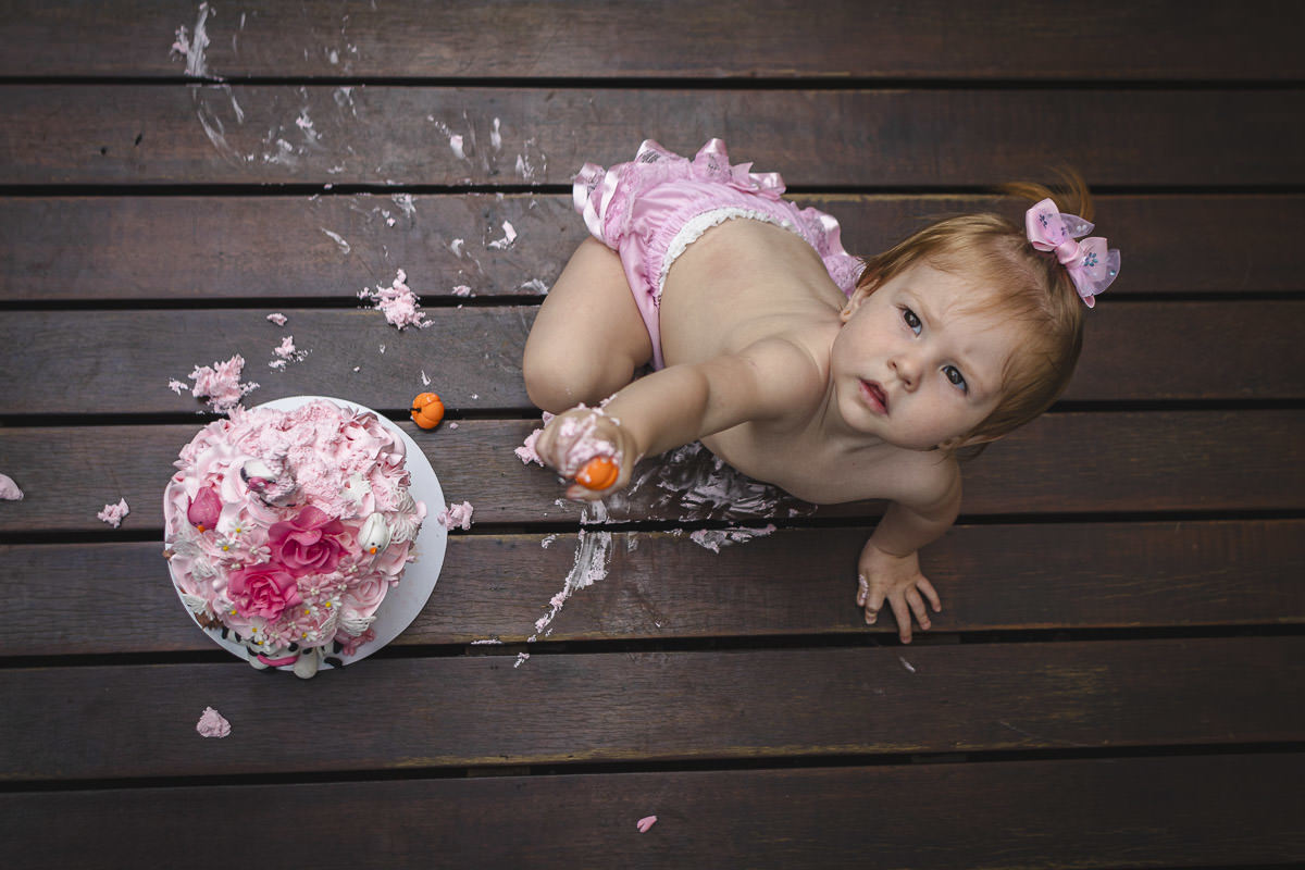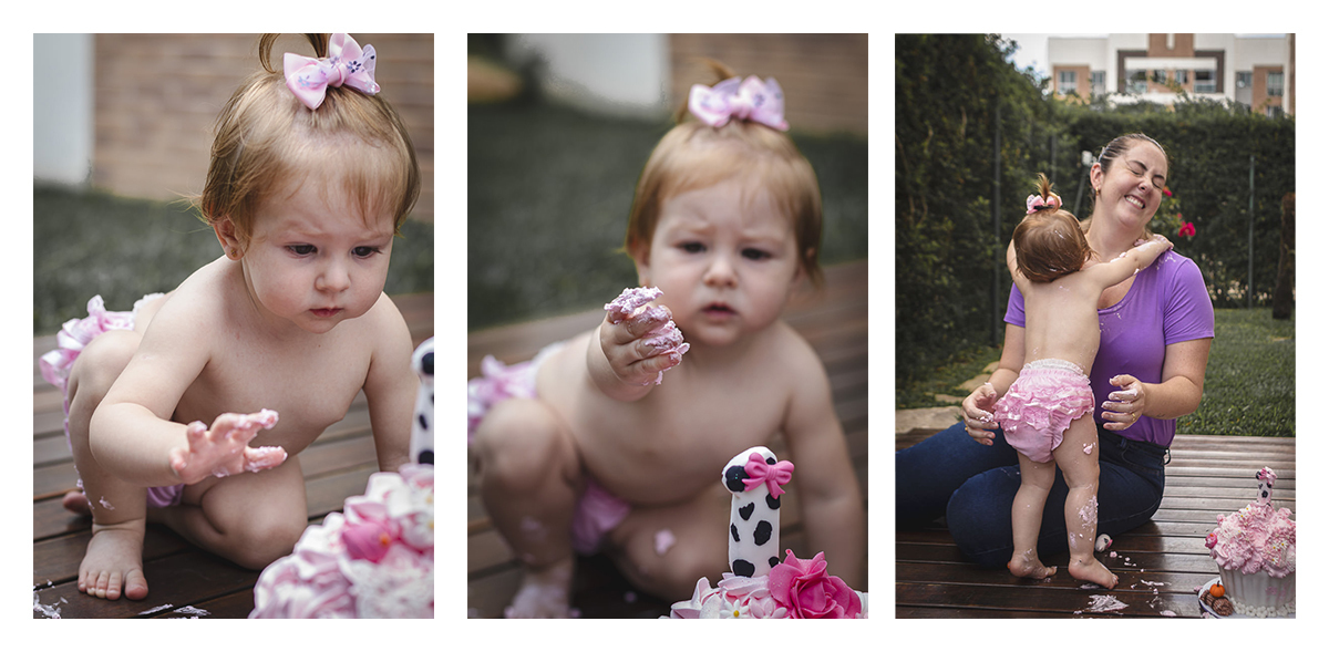 A sessão dos 10 meses foi próxima ao Natal e aproveitei para fazer algumas fotos na árvore da família, mas foi na sessão de 12 meses que a Isa juntou com uma sessão de Smash the Cake e foi aquela lambança no quintal, inclusive a Isa aproveitou para fazer uma decoração com o glacê do bolo escrevendo com o dedo mesmo a frase: Maria Antonieta 1 ano, que ficou super legal para fotografar enquanto eles brincavam com o bolo.