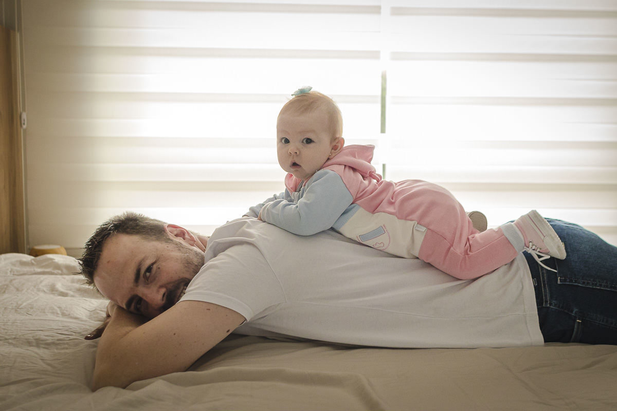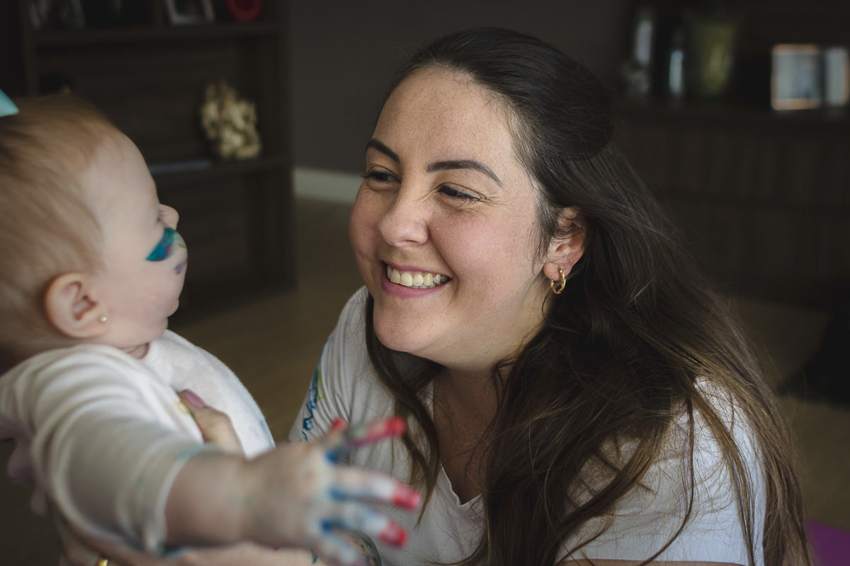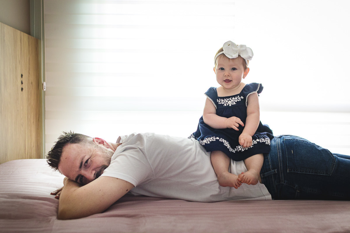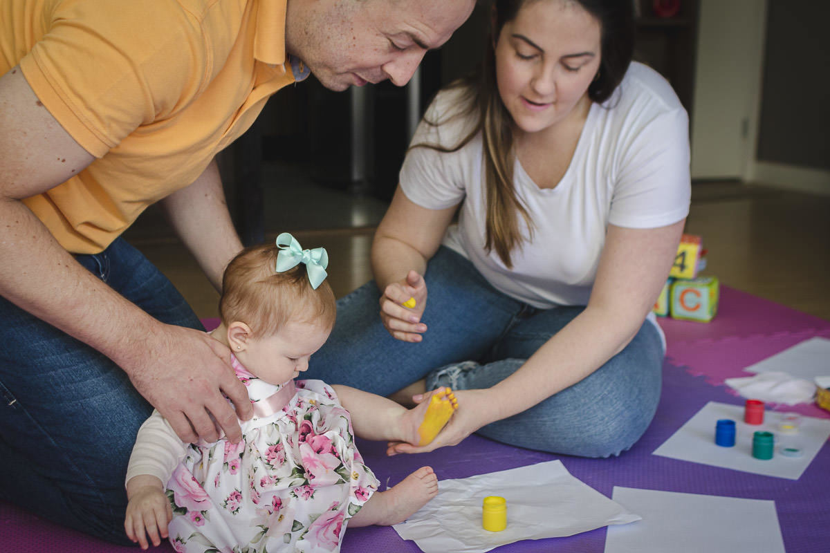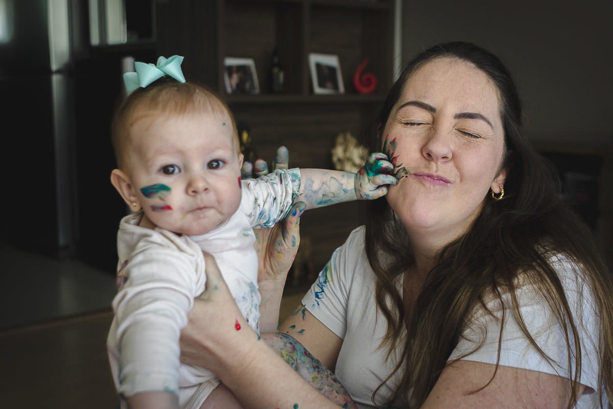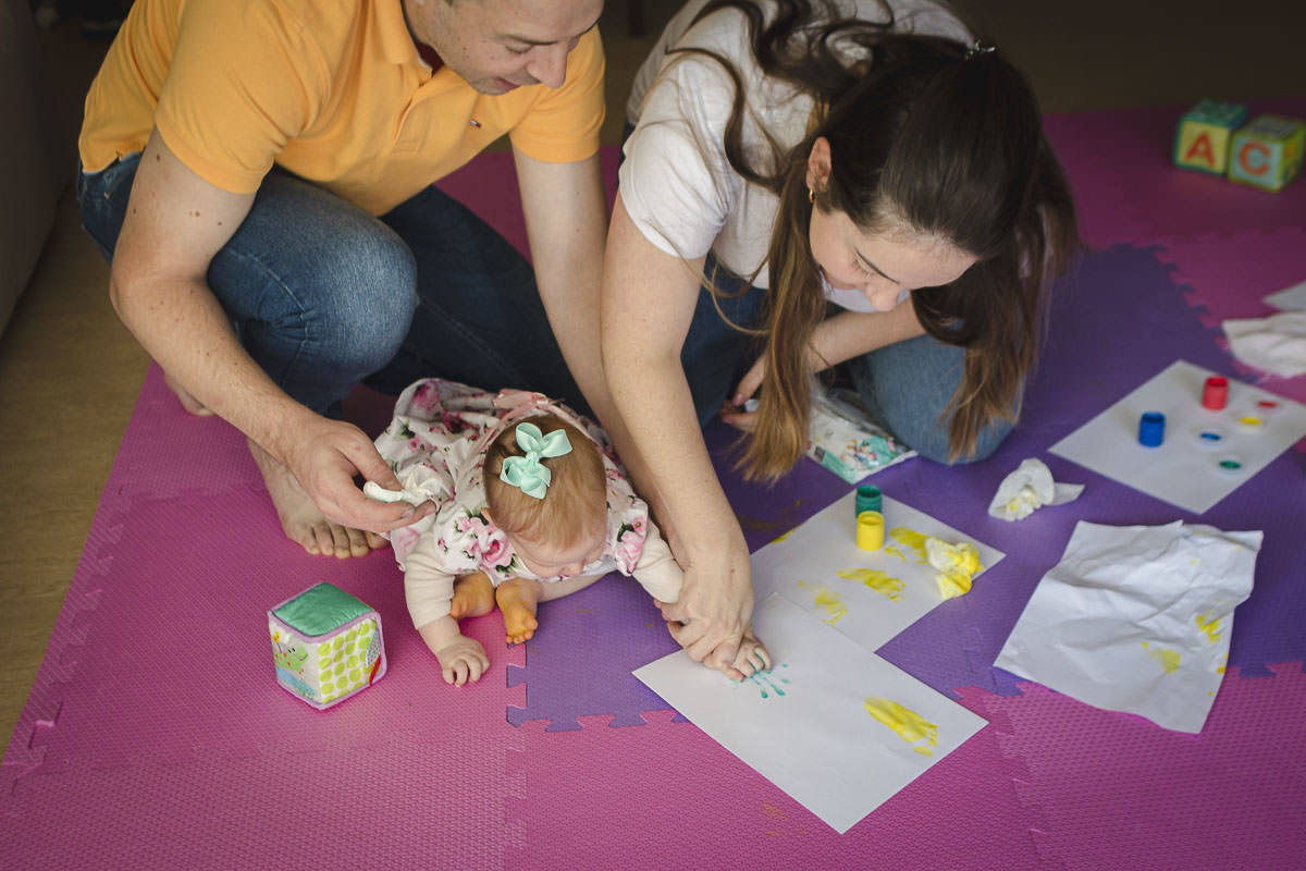 A Isa é uma mãe bem descolada e light, sem excesso de preocupação e bem tranquila para lidar com as situações do cotidiano com a filha. Até mesmo as mais complicadas como o dia em que a Maria Antonieta rolou do sofá e caiu no chão enquanto o Raul trocava a roupinha dela. Com essa característica atípica das mães na sessão de 6 meses, que foi antes do Dia dos Pais, ela comentou comigo queria fazer uma surpresa para o Raul naquela data. Um cartão de Dia dos Pais com os pezinhos e mãozinhas da Maria Antonieta e queria aproveitar para registrar a produção do cartão. Para disfarçar, ela disse a ele que seria para o pia dela... e ele acreditou. 🤦🏻♂️ Bem, já da para imaginar a bagunça, né? Nessa sessão aproveitamos para fazer as fotos da introdução aos alimentos sólidos, que sempre gera fotos legais e engraçadas!