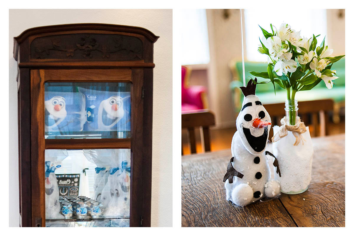 Olha só o que fizemos no aniversário de 1 ano do Cauã. Ele nasceu em novembro, na época ainda morávamos no Rio de Janeiro e como era o início do verão já estava muito calor por lá. Os primeiros meses dele foram no ar condicionado e a cada vez que a gente tirava do fresquinho do ar, ele ficava irritado. Isso acontecia mesmo depois do verão passar. Era uma característica marcante dele. Outra coisa que também chamava atenção era que ele adorava ficar grudado e abraçadinho com a gente. Na hora de escolhemos o tema da festa de 1 ano dele não podia ser outro: OLAF! O Boneco de Neve que adora abraços quentinhos!